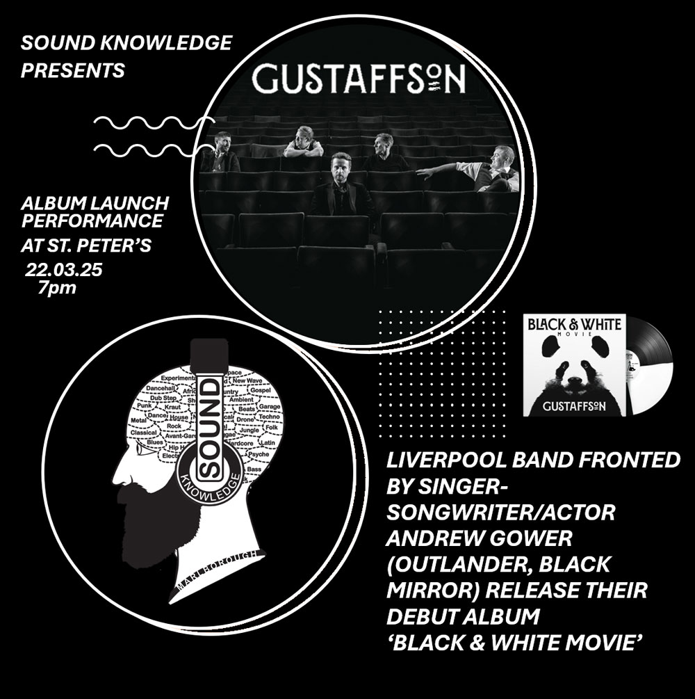 We’re delighted to announce that Gustaffson, the Liverpool band fronted by actor/singer-songwriter Andrew Gower (Outlander, Black Mirror), will be joining us in St. Peter’s Church on Saturday 22nd March, playing live and signing to celebrate the release of their debut album ‘Black & White Movie’. Doors open 7pm.