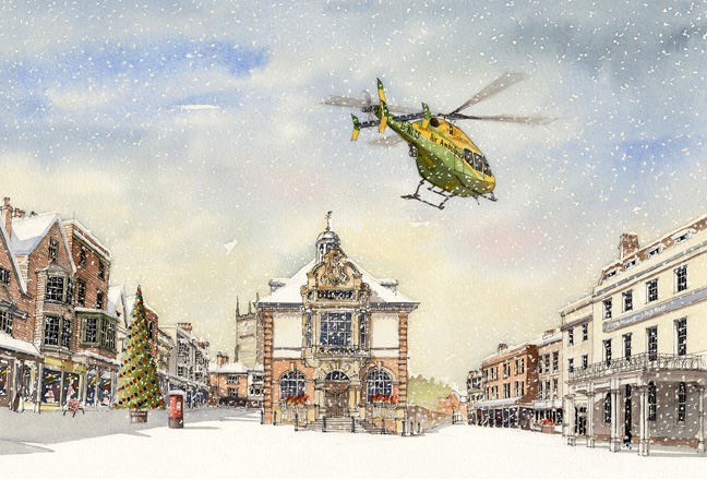 The card was designed, painted and donated by Marlborough artist Colin Palmer. It shows Wiltshire Air Ambulance’s helicopter flying over a snowy Marlborough High Street with the Town Hall in the background.