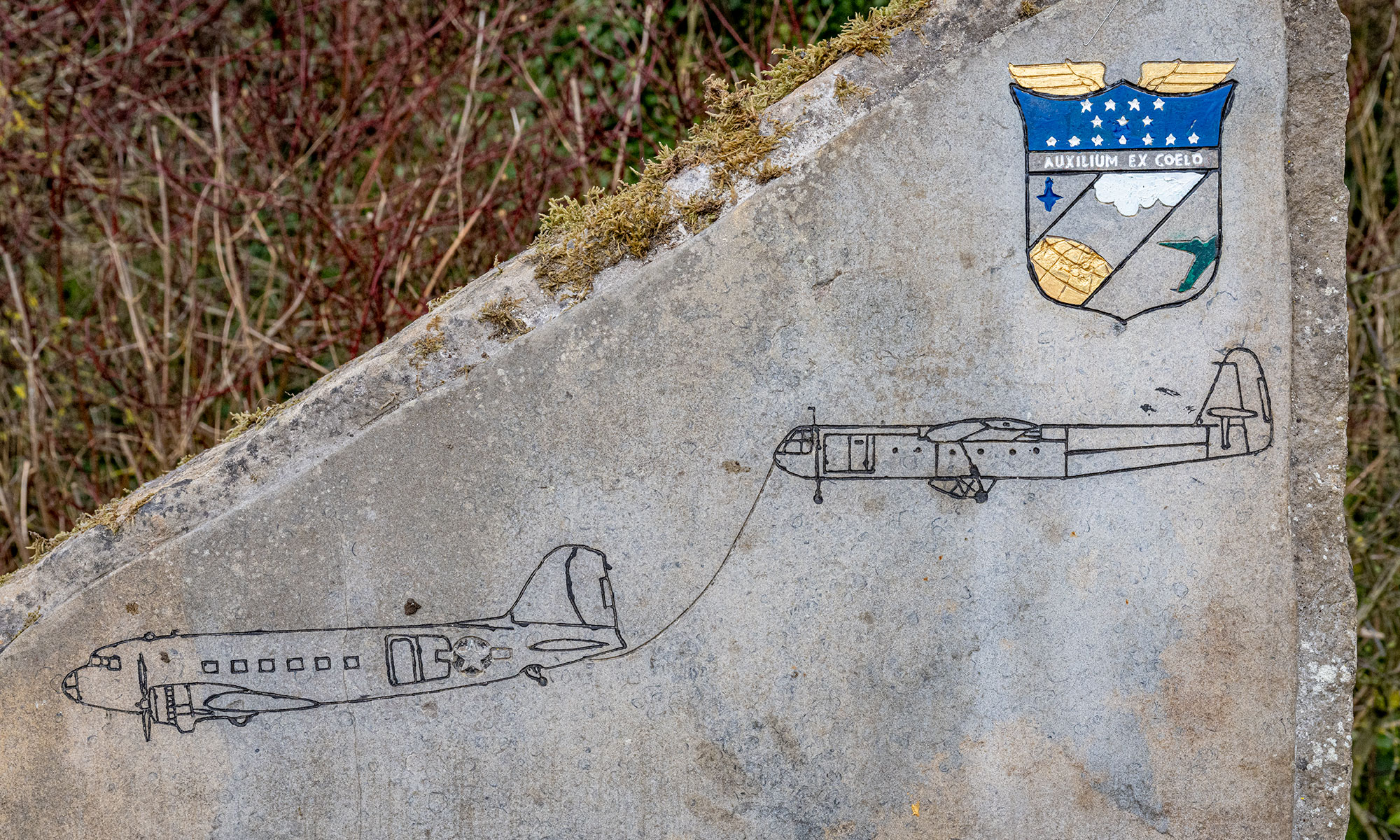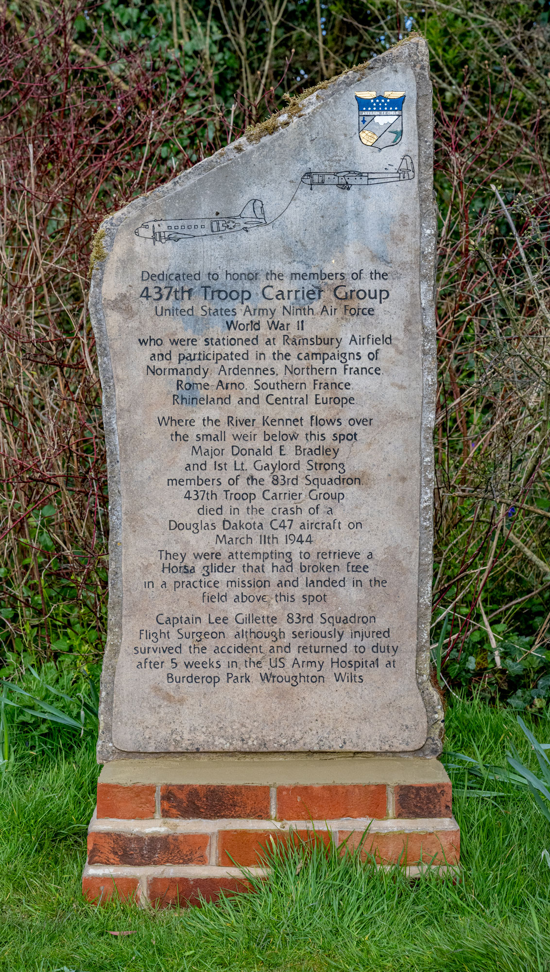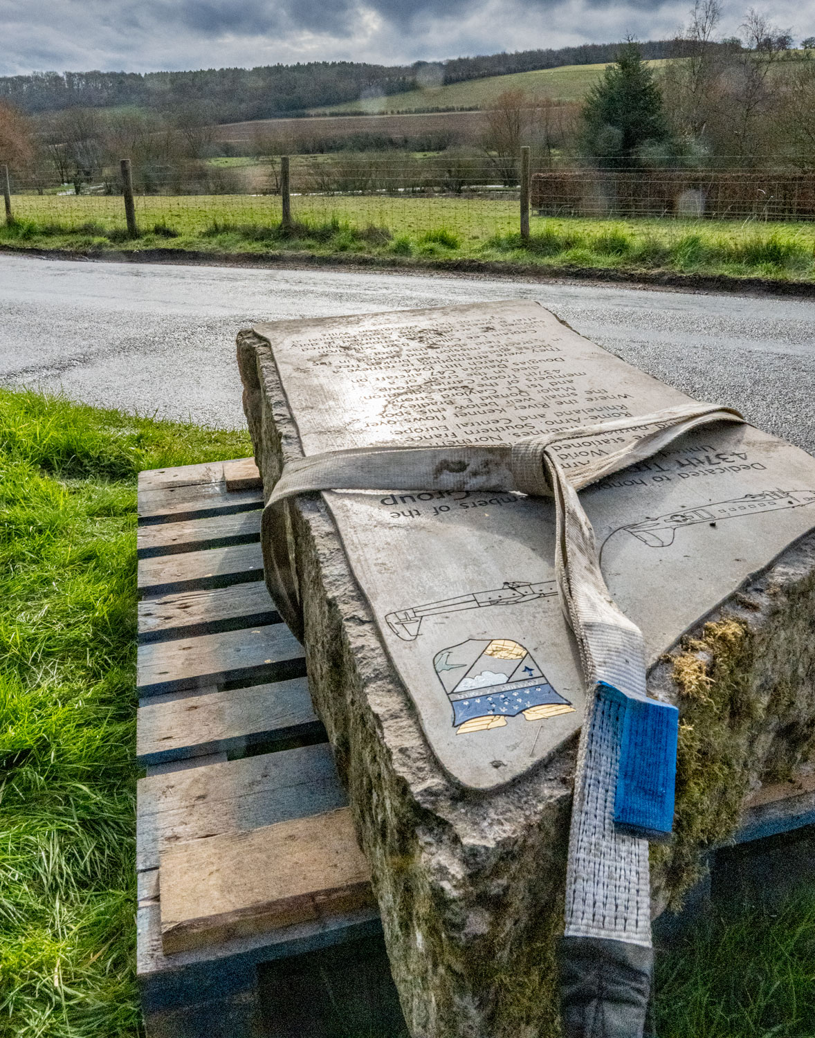 The Memorial Stone to the Axford Dakota and Glider crash, hewn out of a large chunk of beautiful Purbeck Stone was re-sited earlier this morning (Saturday 9 March) on the (near) eightieth anniversary of the incident, moved from it’s location for the past couple of decades or so in the car park of Axford’s Red Lion pub to its new site adjacent to the road going through the village where it overlooks the area where the Dakota, towing a glider crashed into the River Kennet in March 1944.