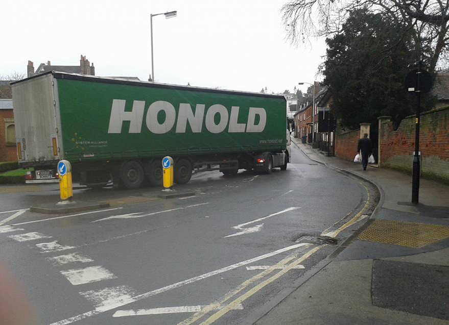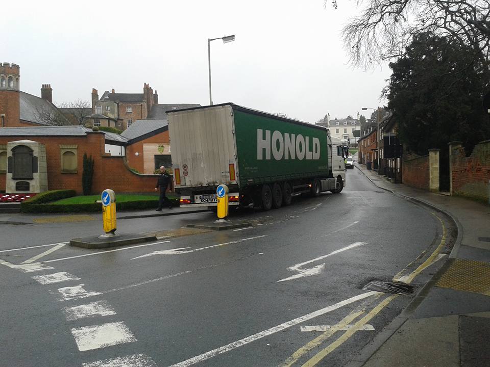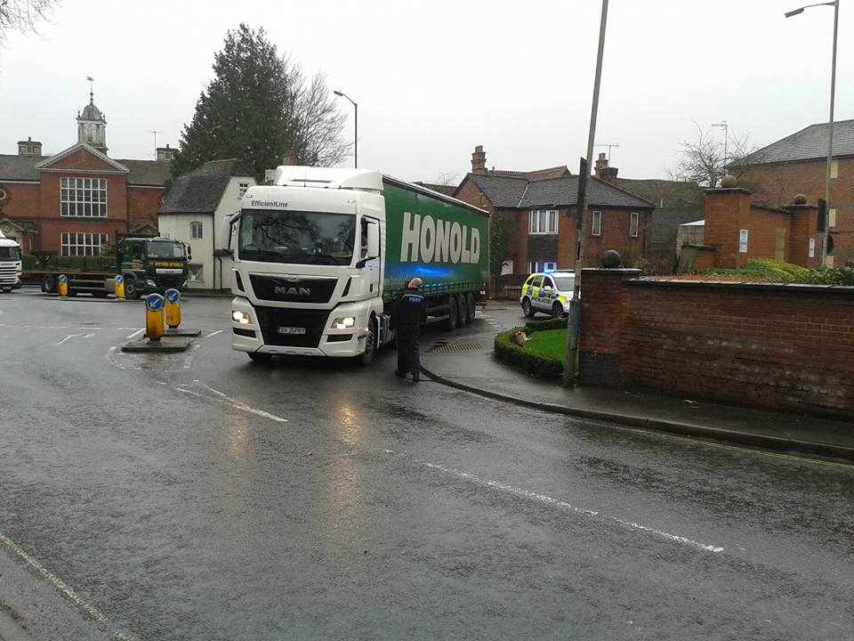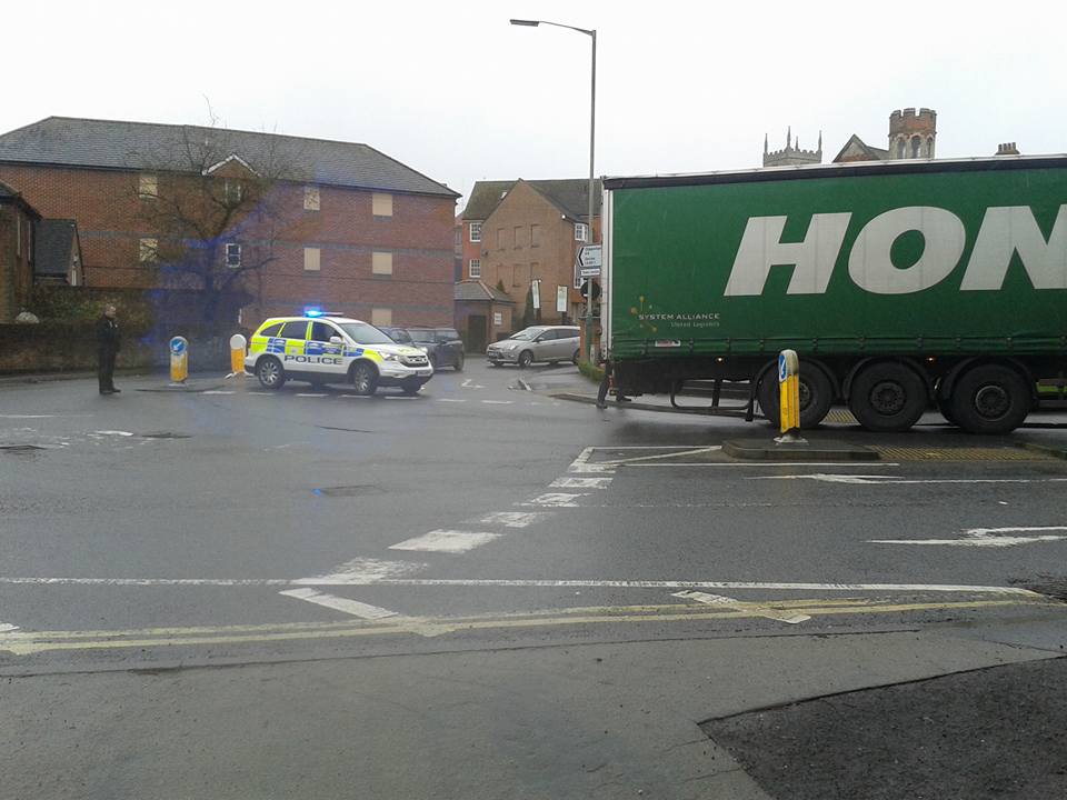 Police oversaw the operation, which involved an articulated lorry belonging to the Romanian logistics firm Honold reverse down Barn Street to the junction of New Road and London Road.
